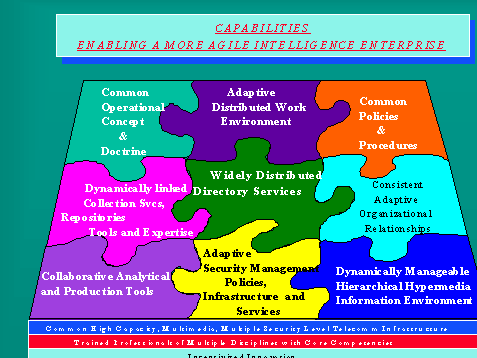 However, besides a common telecommunications infrastructure and operating environment and shared data environment, as is graphically described by the figure, a more comprehensive set of capabilities must be consistently integrated across all Community components to enable and expedite evolution to a more agile intelligence enterprise in the 21st Century.