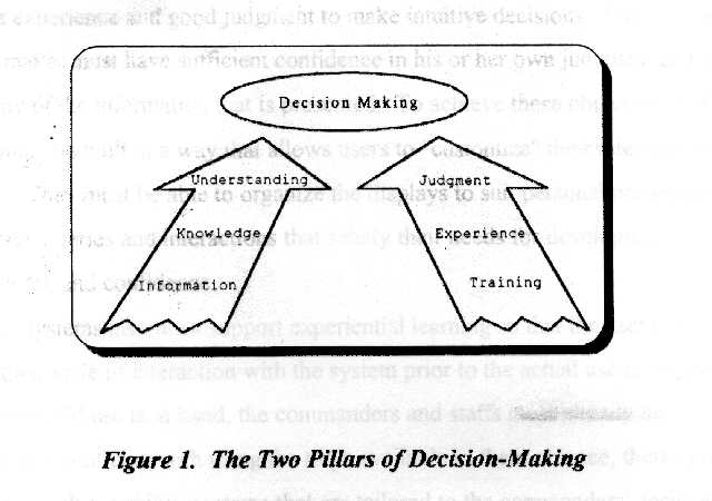 Equally important is increased emphasis on C41 automation as a means for supporting intuitive decision making processes through the effective presentation of knowledge and understanding. This is in contrast to generally applying automation to analytical constructs. This means better dialog between operators and developers to adjust and-adapt their efforts to improve command and control processes and capabilities. Generally, we must recognize that automation is becoming increasingly part of the decision making process itself, not just a set of tools that used within traditional processes of antiquated paradigms. Most important, however, is the need to maintain an understanding of command and control decision making as a function that deals with uncertainty. It is not a straightforward, algorithmic process whereby the decision is "calculated" as a numerically precise result. It involves human decision makers who will confront problems under considerable stress and uncertainty and who will have to make decisions from experience-based judgment. They must be provided the means to extract the best understanding of the situation based on available information and to extend this understanding based on intuition and perception. Possibly, in the distant future, we will have developed machines that can match the human being's capability for pattern recognition and intuitive decision making; but until then, the human decision maker is still the key element 'in the "loop" and information technology must be configured in such a way as to optimize his or her effectiveness within that loop,
