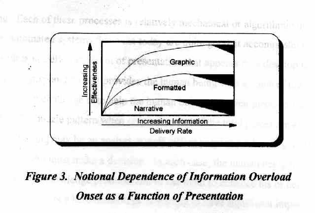 Figure 3 illustrates a notional set of "information overload" or "user saturation" curves that might apply to the form in which the information is delivered. The shaded areas indicate where overload degrades effectiveness. This figure expresses the commonly accepted view (discussed above) that the form of presentation can improve both the effectiveness of the information and the degree to which large quantities of information can be accepted and used by decision-makers. Narrative information (generally teletype or electronic mail) tends to be relatively burdensome to read and to translate into data or other forms of presentation that support further processing into the knowledge base. Formatted information, either tabular or structured data, can be tailored more suitably for rapid insertion into briefings, summary displays, or files. Graphic displays are immediately understandable and can integrate significant amounts of information into concise pictures with overlay symbology or annotation.